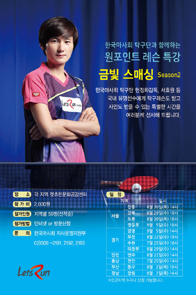 한국마사회 탁구단은 7월25일부터 9월5일까지 시민들을 대상으로 원포인트 레슨 탁구특강을 진행한다. 한국마사회 탁구단의 현정화 감독, 서효원 선수 등이 직접 지도하는 ‘금빛 스매싱’ 프로그램으로, 지난해 처음 시행 당시 호응이 뜨거워 올해 시즌2를 마련했다.
