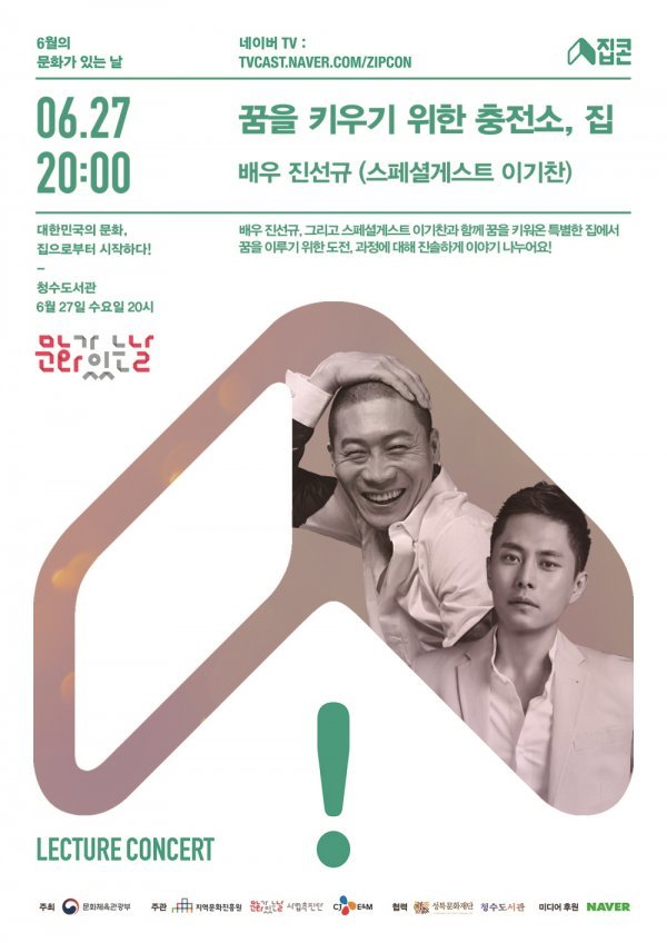매달 마지막 수요일 ‘문화가 있는 날’ 열리는 ‘집콘’이 27일, 신스틸러 배우 진선규의 렉처콘서트 ‘꿈을 키우는 충전소, 집’을 진행한다. 배우 진선규는 오랜 무명생활을 거쳐 배우로 이름을 알리기까지의 이야기를 솔직 담백하게 나누고, 그가 생각하는 ‘꿈’과 ‘연기’에 대해 관객들과 소통할 예정이다. 특별히 이번 6월 집콘에는 가수 겸 배우 이기찬이 스페셜 게스트로 출연, 달콤한 라이브 무대를 예고하고 있어 기대를 모으고 있다.