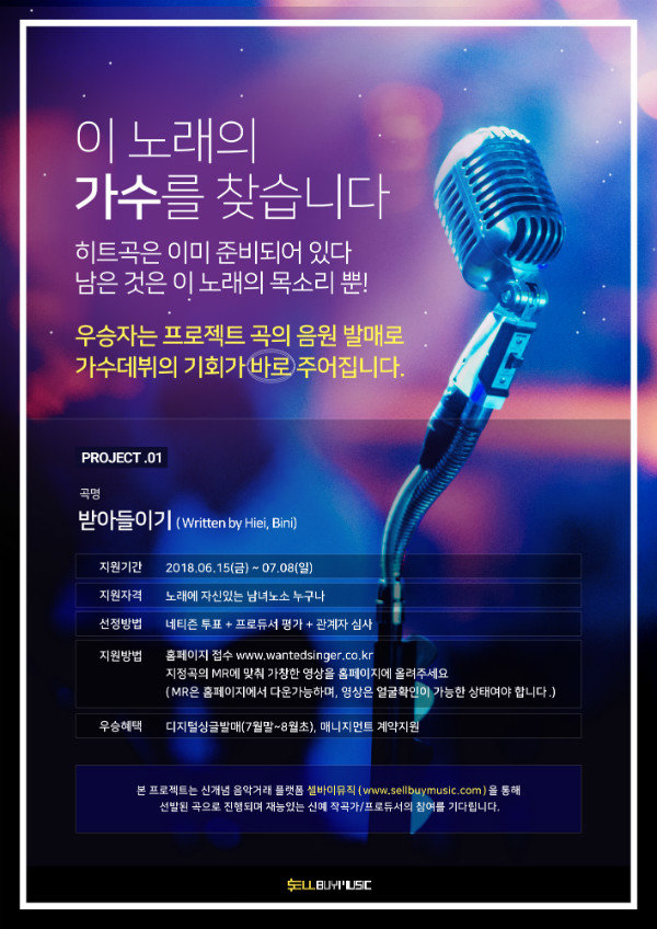 프로젝트 곡 ‘받아들이기’는 셀바이뮤직 공모전을 통해 선발된 재능 있는 신예 작곡가 ‘Hiei’와 ‘Bini’가 완성한 곡으로 일상의 대화에서 많이 사용되는 \'받아들이자\'는 표현에 모티브를 얻어 작업하여 완성했다. \'받아들이기\'는 인정하고 싶지 않은 이별을 담담히 받아들일 수밖에 없는 상황과 상실감에 대해 잔잔하면서도 서정적인 선율의 발라드로 표현한 곡으로 곡에 딱 맞는 감성 넘치는 보컬의 탄생을 기다리고 있다.