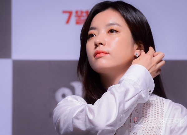 배우 한효주가 18일 서울 강남구 압구정로에 위치한 CGV 압구정에서 열린 영화 ‘인랑’ 제작보고회에서 머리를 만지고 있다.