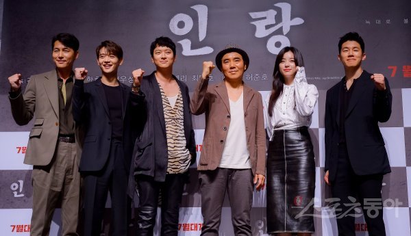 18일 서울 강남구 압구정로에 위치한 CGV 압구정에서 열린 영화 ‘인랑’ 제작보고회에서 감독과 주연 배우들이 포즈를 취하고 있다. 왼쪽부터 배우 정우성, 최민호(샤이니 민호), 강동원, 김지운 감독, 한효주, 김무열.