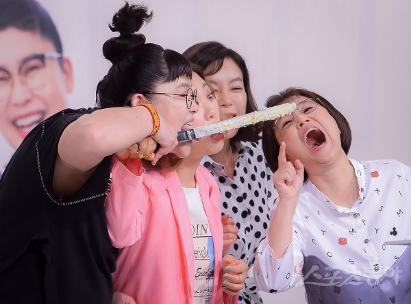 개그우먼 이영자와 김숙, 방송인 최화정, 개그우먼 송은이(왼쪽부터)가 18일 서울 영등포 타임스퀘어 내 아모리스 홀에서 열린 올리브 ‘밥블레스유’ 제작발표회에 참석해 익살스러운 포즈를 취하고 있다.