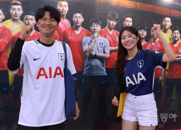 18일 서울 강남구 삼성동 영동대로에 위치한 현대자동차 팬파크에서 2018 러시아월드컵 조별예선 F조 대한민국과 스웨덴의 경기를 앞두고 거리응원이 펼쳐졌다. 손흥민의 소속팀 토트넘의 유니폼을 입은 커플이 카메라를 보며 포즈를 취하고 있다.