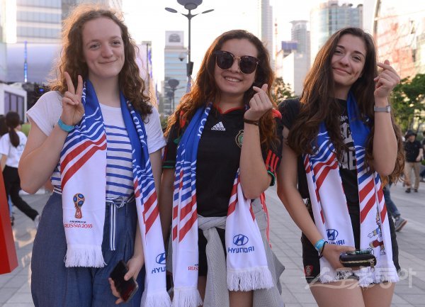 18일 서울 강남구 삼성동 영동대로에 위치한 현대자동차 팬파크에서 2018 러시아월드컵 조별예선 F조 대한민국과 스웨덴의 경기를 앞두고 거리응원이 펼쳐졌다. 이탈리아와 멕시코에서 온 여성 축구팬들이 카메라를 보며 포즈를 취하고 있다.