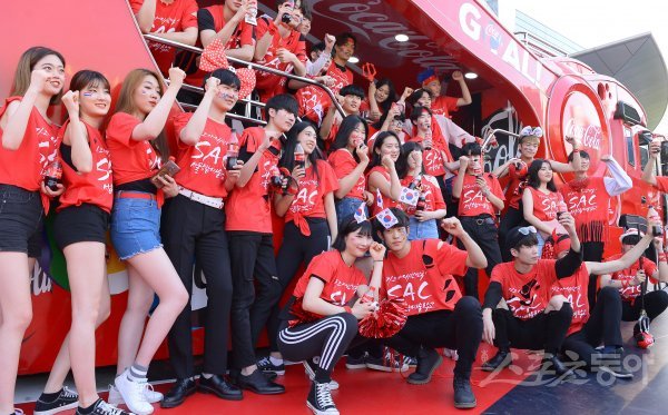 18일 서울 강남구 삼성동 영동대로에 위치한 현대자동차 팬파크에서 2018 러시아월드컵 조별예선 F조 대한민국과 스웨덴의 경기를 앞두고 거리응원이 펼쳐졌다. 서울종합예술학교 학생들이 카메라를 보며 포즈를 취하고 있다.