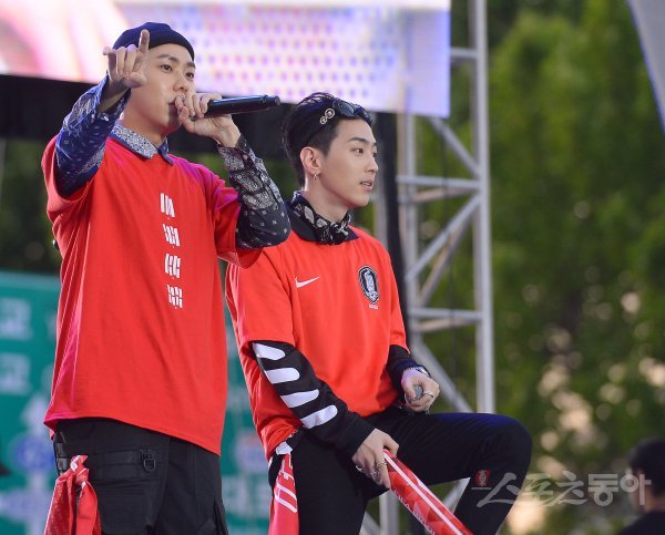18일 서울 강남구 삼성동 영동대로에 위치한 현대자동차 팬파크에서 2018 러시아월드컵 조별예선 F조 대한민국과 스웨덴의 경기를 앞두고 거리응원이 펼쳐졌다. 랩퍼 로꼬와 그레이(오른쪽)가 열정적인 무대를 펼치고 있다.