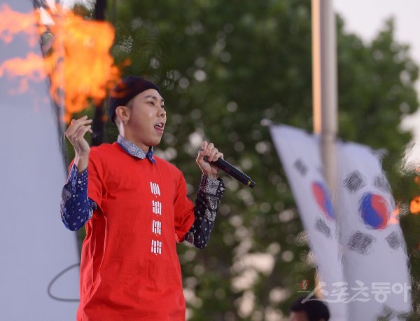 18일 서울 강남구 삼성동 영동대로에 위치한 현대자동차 팬파크에서 2018 러시아월드컵 조별예선 F조 대한민국과 스웨덴의 경기를 앞두고 거리응원이 펼쳐졌다. 랩퍼 로꼬가 열정적인 무대를 펼치고 있다.