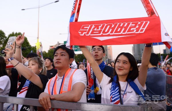 18일 서울 강남구 삼성동 영동대로에 위치한 현대자동차 팬파크에서 2018 러시아월드컵 조별예선 F조 대한민국과 스웨덴의 경기를 앞두고 거리응원이 펼쳐졌다. 여성 축구팬이 응원 문구가 적힌 카드를 들어보이며 포즈를 취하고 있다.