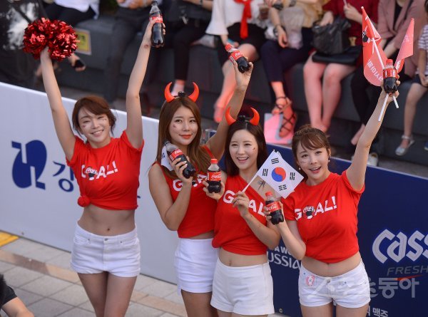 18일 서울 강남구 삼성동 영동대로에 위치한 현대자동차 팬파크에서 2018 러시아월드컵 조별예선 F조 대한민국과 스웨덴의 경기를 앞두고 거리응원이 펼쳐졌다. 여성 축구팬들이 카메라를 보며 포즈를 취하고 있다.