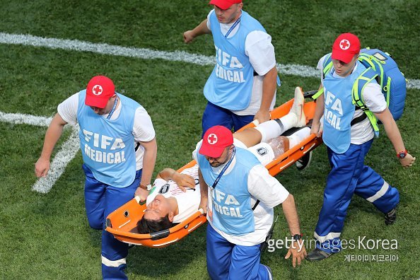 대한민국 축구대표팀 박주호가 부상으로 들 것에 실려 나가는 모습. 사진=게티이미지코리아
