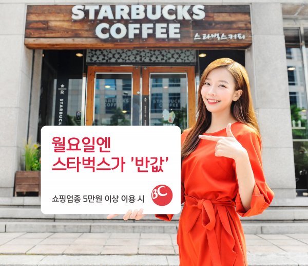 BC카드가 연말까지 매주 월요일 스타벅스 반값 이벤트(사진)를 진행한다. 매주 일요일 오전 11시부터 자정까지 이벤트 홈페이지에 선착순으로 응모한 1만명을 대상으로 신청일 다음날인 월요일에 스타벅스에서 결제한 1건에 대해 50% 청구할인 혜택을 제공한다. 고객 1인당 월 1회 참여 가능하며 최대 7000원까지 청구할인 받을 수 있다.