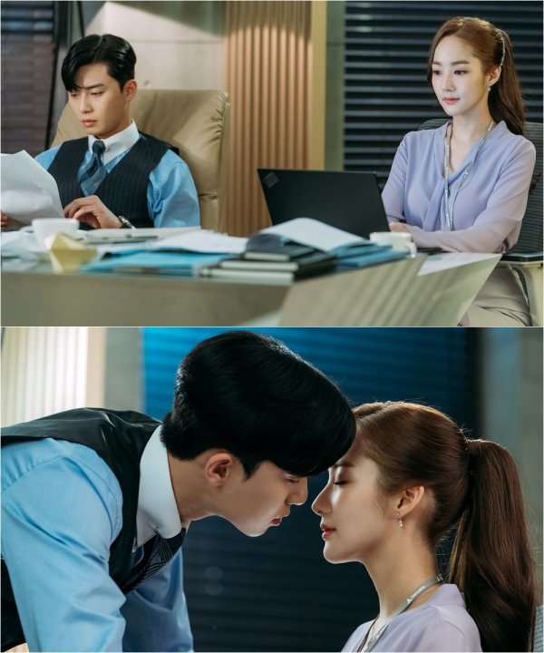 오늘(20일) tvN 수목드라마 ‘김비서가 왜 그럴까’(이하 ‘김비서’) 측은 사무실에서 드디어 가슴 떨리는 첫 키스 1초전 모습을 공개했다. ‘김비서’는 재력, 얼굴, 수완까지 모든 것을 다 갖췄지만 자기애로 똘똘 뭉친 ‘나르시시스트 부회장’ 이영준(박서준 분)과 그를 완벽하게 보좌해온 \'비서계 레전드\' 김미소(박민영 분)의 퇴사밀당로맨스.