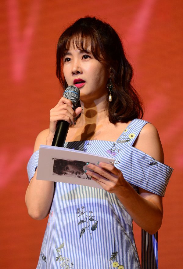 민서의 쇼케이스 사회를 맡은 박소현이 행사를 진행하고 있다.