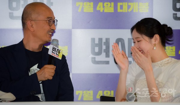 이준익 감독과 배우 김고은(오른쪽)이 20일 서울 강남구 삼성동 메가박스 코엑스에서 열린 영화 ‘변산’ 언론시사회 및 기자간담회에서 환하게 웃고 있다.