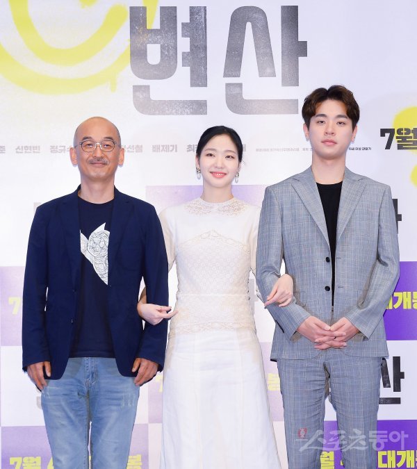 이준익 감독과 배우 김고은, 박정민(왼쪽부터)이 20일 서울 강남구 삼성동 메가박스 코엑스에서 열린 영화 ‘변산’ 언론시사회 및 기자간담회에서 환하게 웃으며 포즈를 취하고 있다.