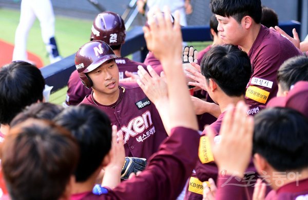 20일 잠실야구장에서 ‘2018 신한은행 마이카 KBO리그’ 두산 베어스와 넥센 히어로즈의 경기가 열렸다. 2회초 무사 만루에서 넥센 김혜성의 2타점 적시타 때 득점에 성공한 고종욱이 동료들의 환영을 받고 있다.