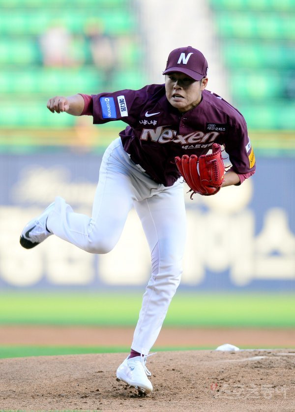 20일 잠실야구장에서 ‘2018 신한은행 마이카 KBO리그’ 두산 베어스와 넥센 히어로즈의 경기가 열렸다. 넥센 선발투수 김정인이 힘차게 볼을 던지고 있다.