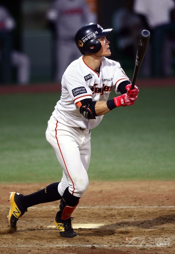 20일 청주야구장에서 ‘2018 신한은행 MY CAR KBO리그’ LG트윈스와 한화이글스 경기가 열렸다. 4회말 무사 1,2루 한화 강경학이 역전 1타점 중전 안타를 치고 있다.
