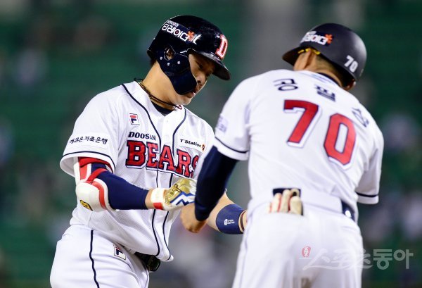 20일 잠실야구장에서 ‘2018 신한은행 마이카 KBO리그’ 두산 베어스와 넥센 히어로즈의 경기가 열렸다. 5회말 1사 1루에서 두산 박세혁이 넥센 양현을 상대로 우월 투런 홈런을 쏘아 올린 뒤 공필성 코치의 환영을 받고 있다.