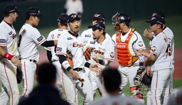 20일 청주야구장에서 ‘2018 신한은행 MY CAR KBO리그’ LG트윈스와 한화이글스 경기가 열렸다. 11-7 승리를 거둔 한화 선수들이 하이파이브 하고 있다.