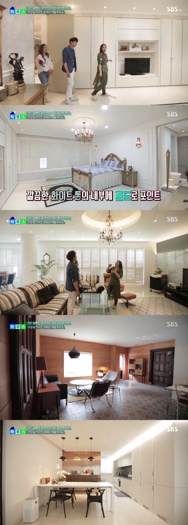 공개된 안방은 깔끔한 화이트 톤에 골드로 포인트를 준 모습이다. 거실은 직접 발품 팔아 고른 샹들리에가 눈길을 끌었다. 특히 우물처럼 파여있는 천장 몰딩은 화려함을 더했다.