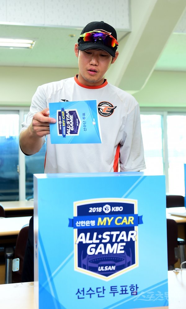 21일 청주야구장에서 ‘2018 신한은행 MY CAR KBO리그’ LG트윈스와 한화이글스 경기가 열린다. 경기 전 한화 하주석이 올스타전 선수단 투표를 하고 있다.