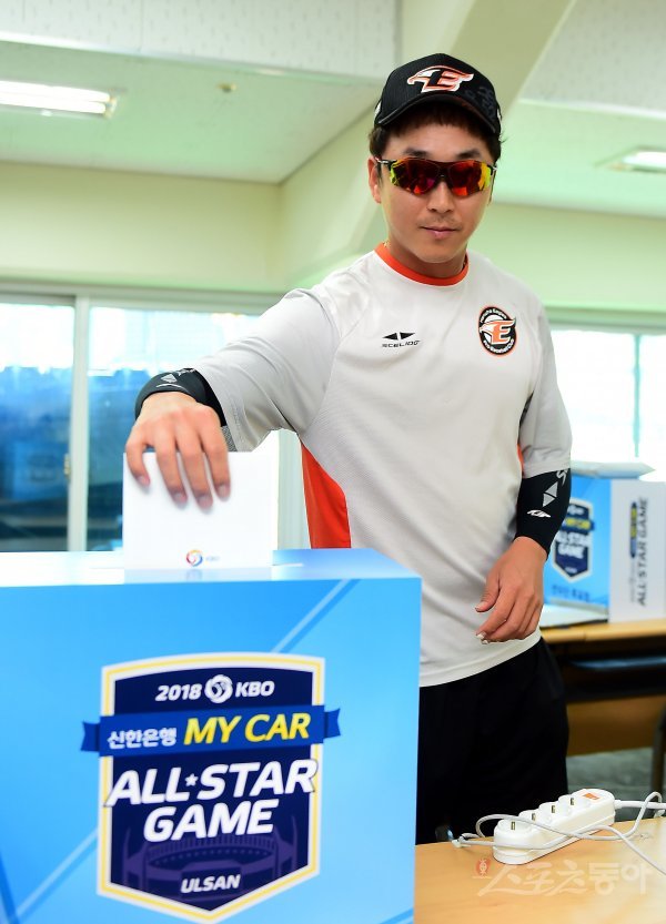 21일 청주야구장에서 ‘2018 신한은행 MY CAR KBO리그’ LG트윈스와 한화이글스 경기가 열린다. 경기 전 한화 정우람이 올스타전 선수단 투표를 하고 있다.