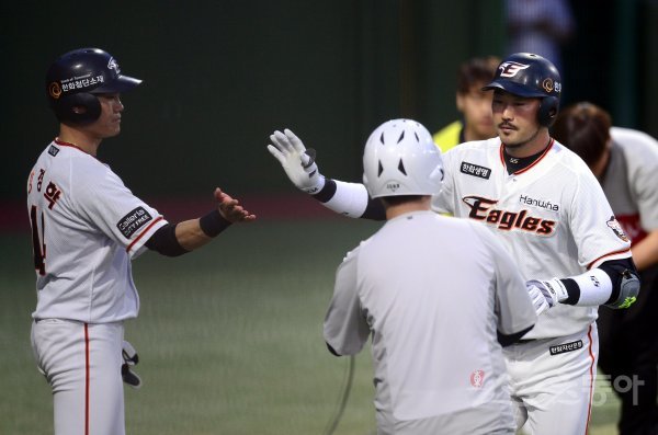 21일 청주야구장에서 ‘2018 신한은행 MY CAR KBO리그’ LG트윈스와 한화이글스 경기가 열렸다. 3회말 1사 1루 한화 송광민이 중월 투런 홈런을 날리그 그라운드를 돌아 홈인해 하이파이브 하고 있다.