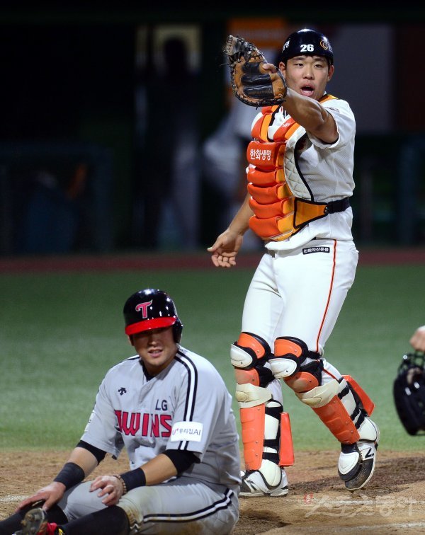 21일 청주야구장에서 ‘2018 신한은행 MY CAR KBO리그’ LG트윈스와 한화이글스 경기가 열렸다. 8회초 1사 3루 LG 정주현 외야플라이 아웃 때 3루주자 유강남이 태그업 시도해 홈으로 달렸으나 한화 지성준에게 태그아웃되고 있다.