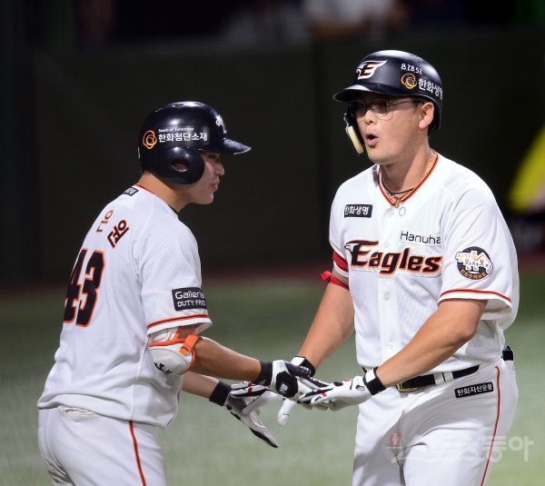 21일 청주야구장에서 ‘2018 신한은행 MY CAR KBO리그’ LG트윈스와 한화이글스 경기가 열렸다. 8회말 2사 1루 대타 한화 이성열이 동점을 만드는 투런 홈런을 날리고 그라운드를 돌아 홈인해 하이파이브 하고 있다