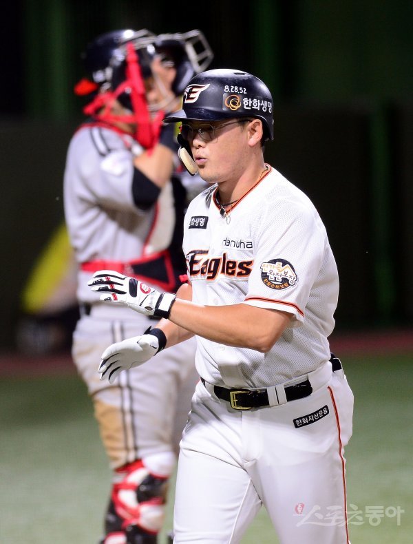 21일 청주야구장에서 ‘2018 신한은행 MY CAR KBO리그’ LG트윈스와 한화이글스 경기가 열렸다. 8회말 2사 1루 대타 한화 이성열이 동점을 만드는 투런 홈런을 날리고 그라운드를 돌아 홈인해 하이파이브 하고 있다