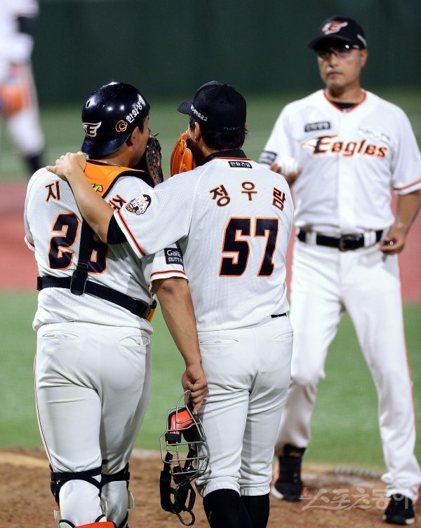 21일 청주야구장에서 ‘2018 신한은행 MY CAR KBO리그’ LG트윈스와 한화이글스 경기가 열렸다. 9회초 2사 한화 정우람이 교체 등판하며 포수 지성준과 이야기하고 있다.
