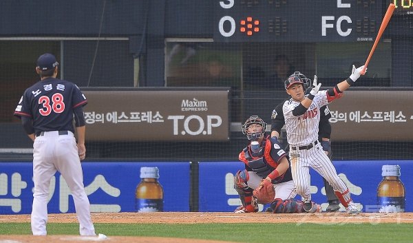 23일 서울 잠실야구장에서 ‘2018 신한은행 MY CAR KBO리그’ 롯데자이언츠와 LG트윈스 경기가 열렸다. 4회말 1사 1,2루에서 LG 정주현이 롯데 선발 노경은을 상대로 스리런 홈런을 치고 있다.