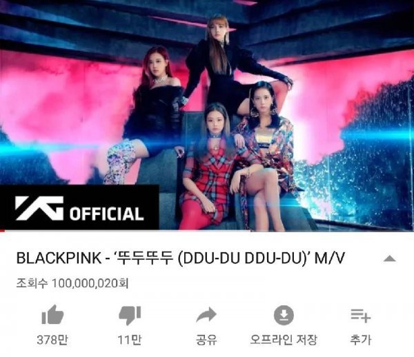 그룹 블랙핑크가 신곡 ‘뚜두뚜두’ 뮤직비디오 조회수 1억뷰를 달성했다. K팝 걸그룹 최단 기간 기록이다.