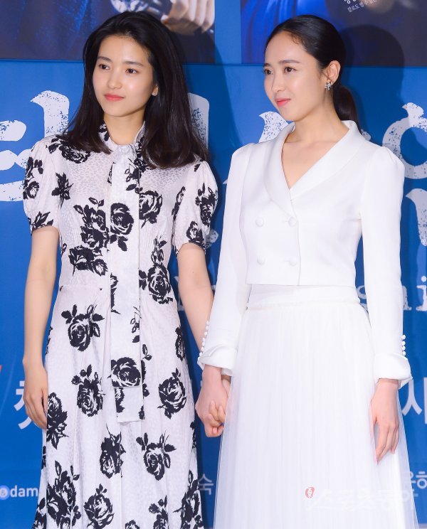 배우 김태리와 김민정(오른쪽)이 26일 서울 강남구 논현동 파티오나인에서 열린 tvN 새 토일드라마 ‘미스터 션샤인’ 제작발표회에서 포즈를 취하고 있다.