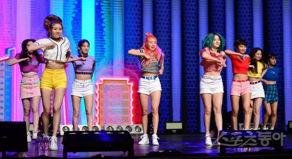 모모랜드가 타이틀곡 배엠(BAAM)을 공연하고 있다.
