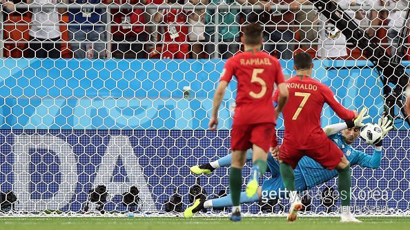 2018러시아월드컵 조별리그 B조 3차전 포르투갈과 이란의 경기 중 페널티킥 찬스를 얻은 포르투갈 축구대표팀 호날두의 슛을 막는 이란 골키퍼의 모습. 사진=게티이미지코리아