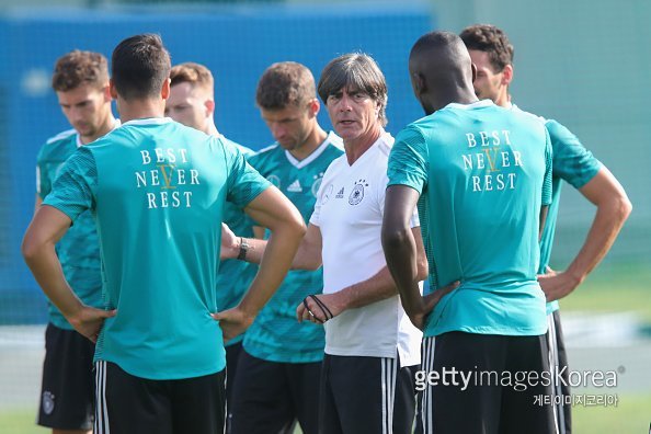 독일 축구대표팀 감독 요하임 뢰브와 미팅중인 독일 축구대표팀 선수들. 사진=게티이미지코리아