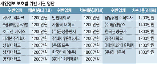 이 밖에 남양유업, 네이처리퍼블릭, 베어트리파크, 블루아일랜드개발, 더리본, 금성출판사. 좋은책 신사고, 에이치피코리아 등의 기업과 성결대, 상지대, 명지대, 인천대, 가톨릭대, 광주대 등의 대학들도 1000만원 이상의 과태료가 부과됐다. 이들 기관의 명단은 행정안전부 홈페이지에서 확인할 수 있다.