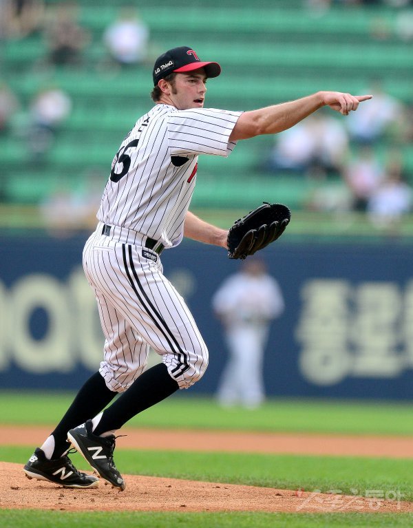 27일 서울 잠실야구장에서 ‘2018 신한은행 MY CAR KBO리그’ kt위즈와 LG트윈스 경기가 열렸다. 선발 투수로 등판한 LG 윌슨이 1회초 와이드피칭으로 볼이 뒤로 빠지자 위치를 알려주고 있다.