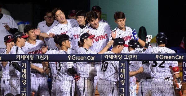 27일 서울 잠실야구장에서 ‘2018 신한은행 MY CAR KBO리그’ kt위즈와 LG트윈스 경기가 열렸다. 5회말 2사 1루 LG 김현수가 중월 투런 홈런을 날리고 그라운드를 돌아 홈인해 하이파이브 하고 있다.