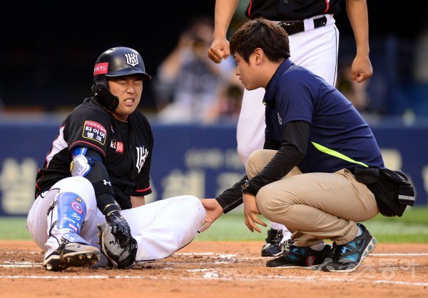 27일 서울 잠실야구장에서 ‘2018 신한은행 MY CAR KBO리그’ kt위즈와 LG트윈스 경기가 열렸다. 3회초 1사 kt 강백호가 왼쪽발에 사구를 맞아 고통스러워 하고 있다.