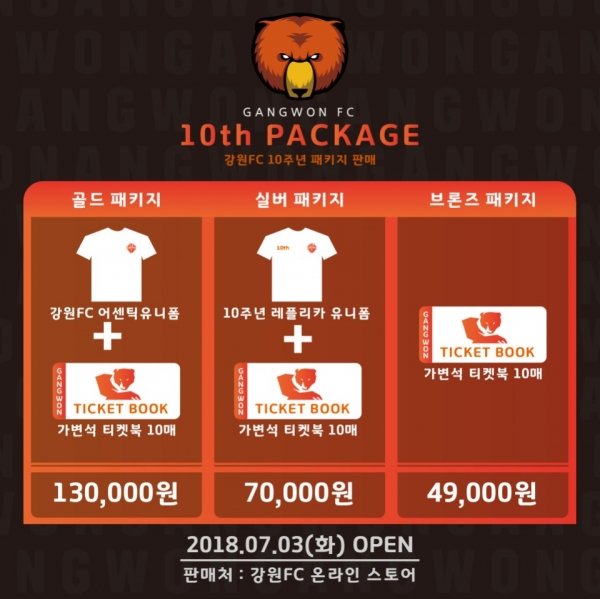 강원FC는 창단 10주년을 맞아 팬들을 위한 골드·실버·브론즈 등 3가지 종류의 기념 패키지 상품을 출시한다. 판매는 다음달 3일부터 시작된다.