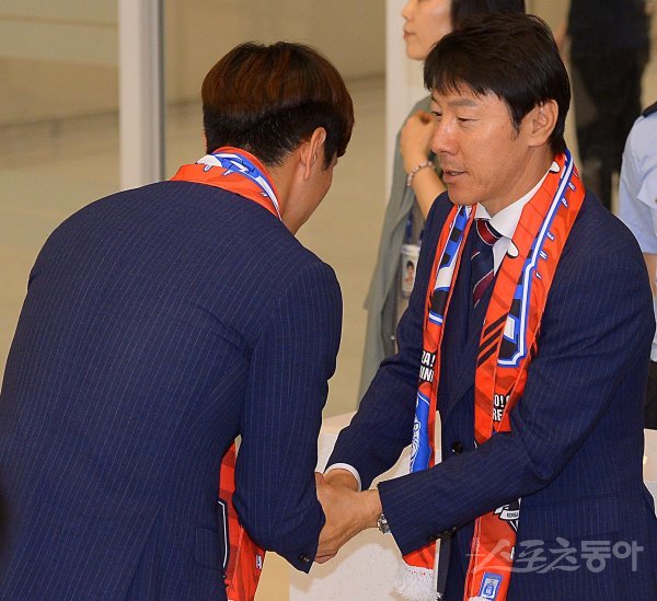 ‘2018 러시아 월드컵’ 일정을 마친 대한민국 축구 국가대표팀이 29일 인천국제공항 제2여객터미널을 통해 입국했다. 축구대표팀 신태용 감독이 기자간담회를 마친 김영권(왼쪽)과 악수를 나누고 있다.