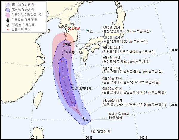 29일 일본 오키나와 남남동쪽에서 발생한 제7호 태풍 ‘쁘라삐룬’(Prapiroon)이 한반도에 직접적인 영향을 미칠 것으로 예상된다. 이에 따라 정부는 긴급대책회의를 가진 것.