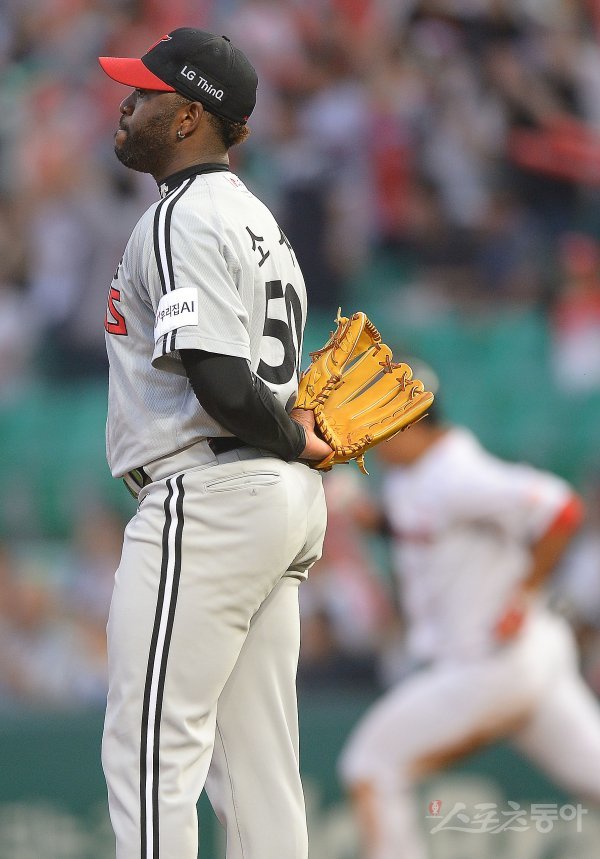 29일 인천 SK행복드림구장에서 ‘2018 신한은행 마이카 KBO리그’ SK 와이번스와 LG 트윈스의 경기가 열렸다. LG 선발 소사가 4회말 2사 2루에서 SK 한동민에게 투런포를 허용한 후 아쉬워하고 있다.
