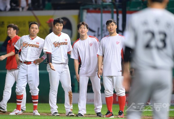 29일 인천 SK행복드림구장에서 열린 ‘2018 신한은행 마이카 KBO리그’ SK 와이번스와 LG 트윈스의 경기에서 SK가 10-1 대승을 거뒀다. 경기 후 승리투수가 된 SK 박종훈(오른쪽 두 번째)이 LG 더그아웃을 바라보며 미소를 짓고 있다.