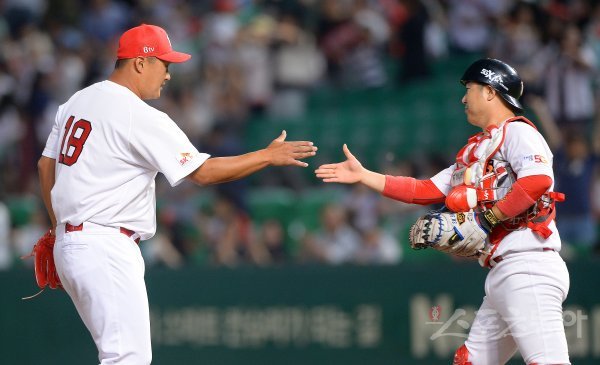 29일 인천 SK행복드림구장에서 열린 ‘2018 신한은행 마이카 KBO리그’ SK 와이번스와 LG 트윈스의 경기에서 SK가 10-1 대승을 거뒀다. 경기 후 SK 정영일과 포수 이성우가 하이파이브를 나누고 있다.