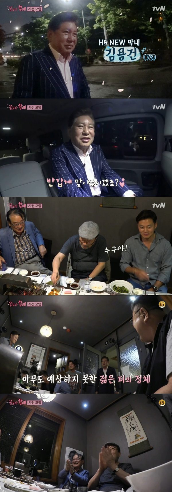 김용건의 등장에 할배들은 박수로 인사를 전했다. 김용건은 “반갑습니다”라고 말하며 한 명 한 명에게 인사를 건넸다.