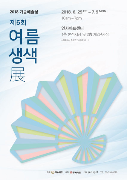 부채표 가송재단이 주최하고 동화약품이 후원하는 제6회 ‘여름생색’展(사진)이 9일까지 인사동 인사아트센터에서 열린다. ‘가송 예술상’ 공모전 본선 진출 작가의 작품을 전시하는 자리이다. 작품 영역의 구분없이 시각예술 전 분야의 젊은 작가들이 지원했으며, 부채 장인과의 콜라보레이션 부문과 부채 주제 부문으로 나눠 1차 포트폴리오, 2차 심층면접을 통해 본선 진출 작가 10명을 선발했다. 전시는 동화약품을 상징하는 부채를 모티브로 작가들의 다양한 상상력과 기법, 소재를 활용해 재창조한 작품을 선보인다.